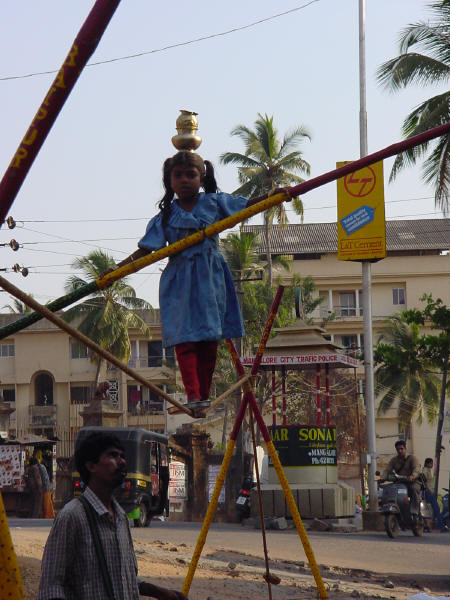 Tightrope walking urchin with pot on head.